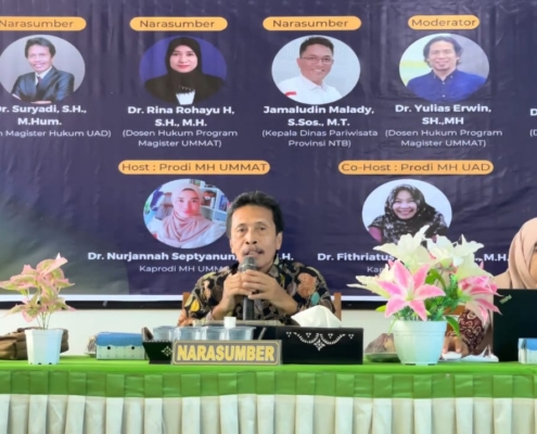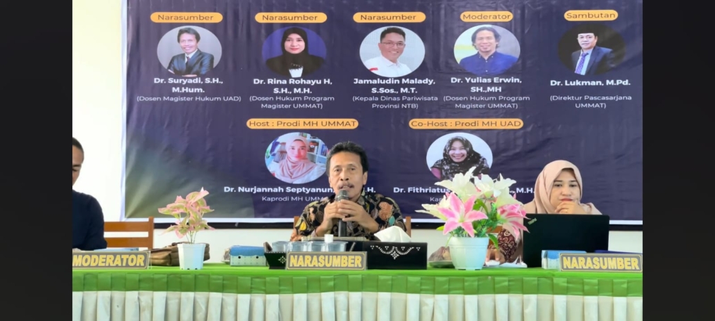 Seminar dilaksanakan bersama antara prodi MH UMMAT dan Prodi MH UAD dengan tema seminar nasional : Penguatan Sektor Pendukung Kepariwisataan Indonesia Dengan Kebijakan Berbasis Kearifan Lokal. Sebagai narasumber dalam kegiatan tersebut daru prodi MH UAD menugaskan Dr. Suryadi, S.H, M.Hum.