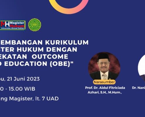 Seminar – Pengembangan Kurikulum Magister Hukum dengan Pendekatan Outcome Based Education (OBE) – 21 Juni 2023, Prodi MH UAD bersama-sama Prodi MIH UMY melaksanakan PKS dengan bersama-sama menjadi peserta aktif dalam raker para Kaprodi MH dilingkungan PTMA dalam Penyusunan Pedoman Kurikulum Prodi MH/MIH di lingkungan PTMA setelah terbitnya Permenristekdikti Nomor 53 Tahun 2023 tentang Penjaminan Mutu Perguruan Tinggi