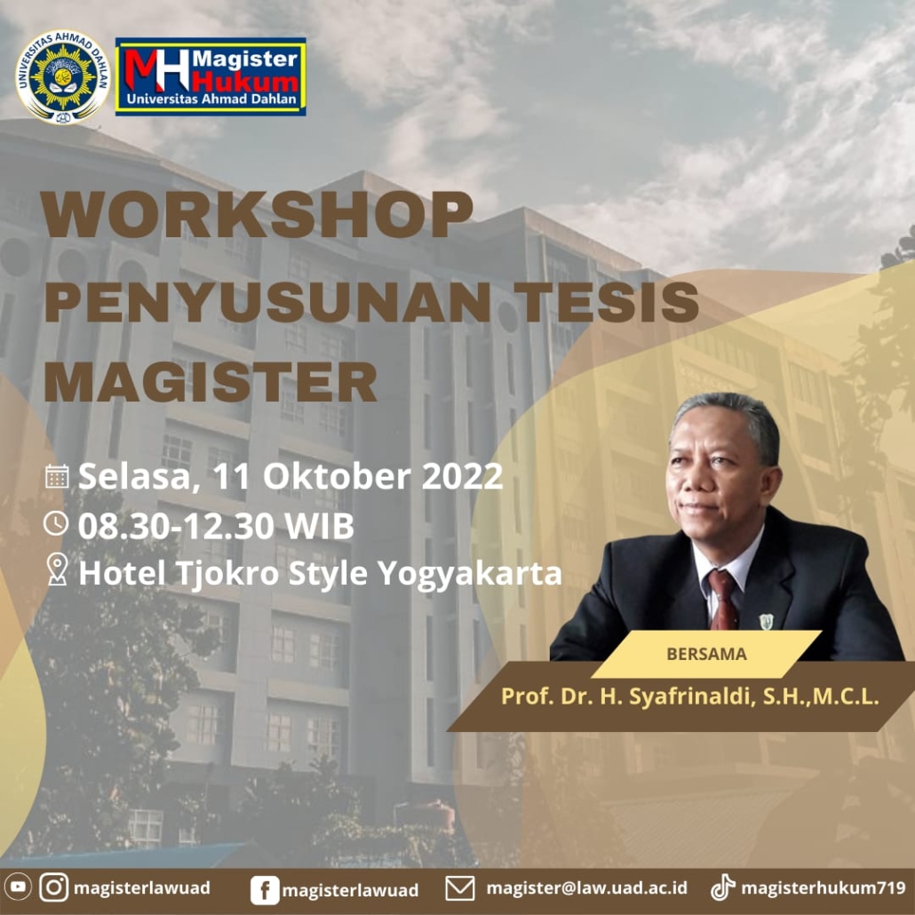 Workshop Penyusunan Tesis Magister, kegiatan diselenggarakan oleh prodi MH UAD dan narasumber dalam kegiatan tersebut dalah Prof. Dr. H.Syafrinaldi,S.H.,MCL. yang merupakan guru besar FH UIR.